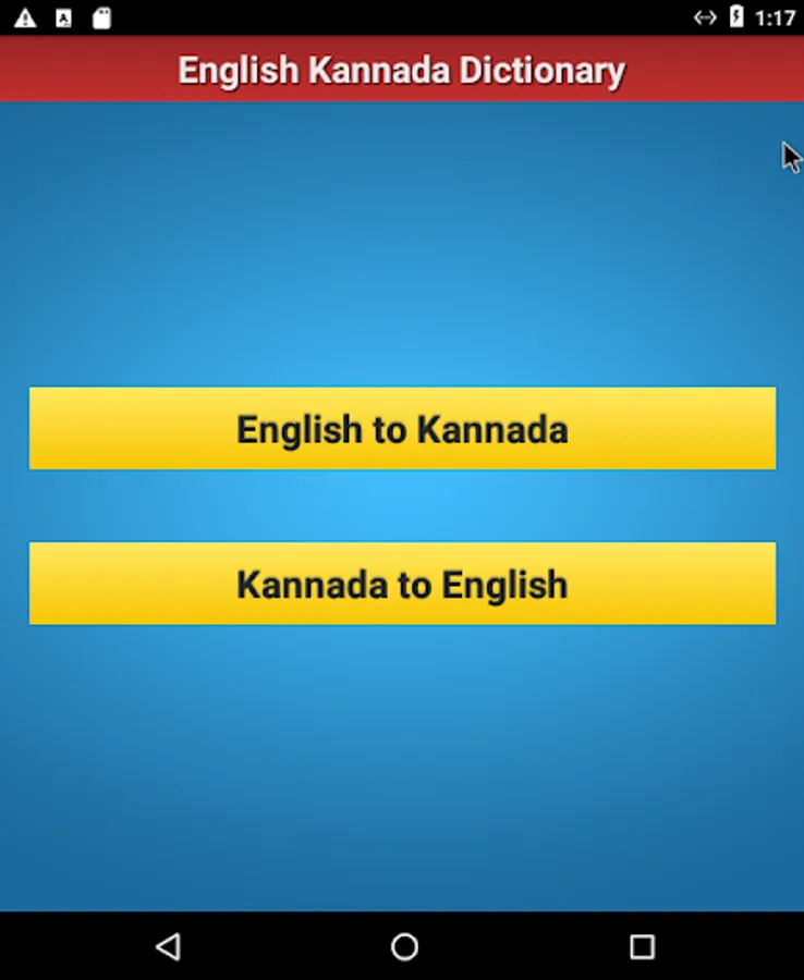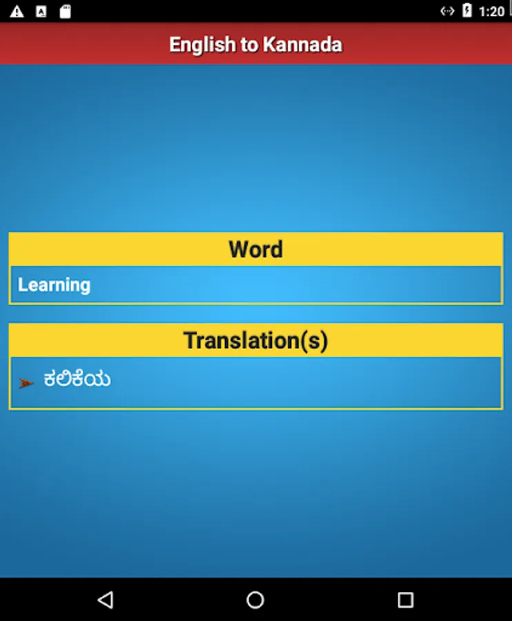Use this dictionary free of cost in finding out English meaning of Kannada words and vice versa. The translator is available at word level and not at sentence level. This app is also the best reference guide among school apps for kids. Help us to make this free dictionary as the popular and best rated app book for Kannada translation to English.