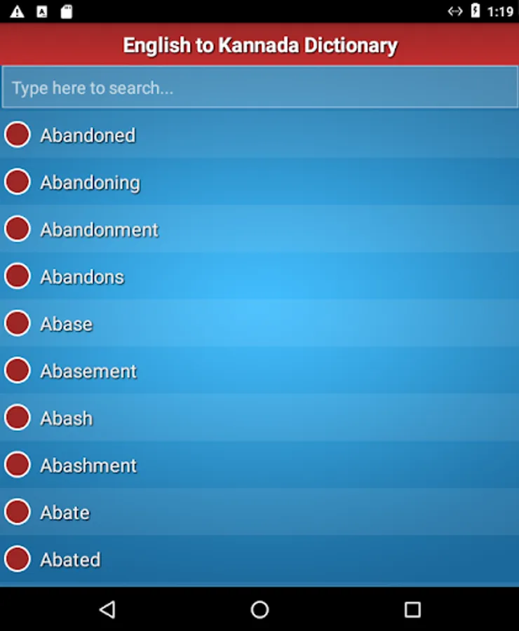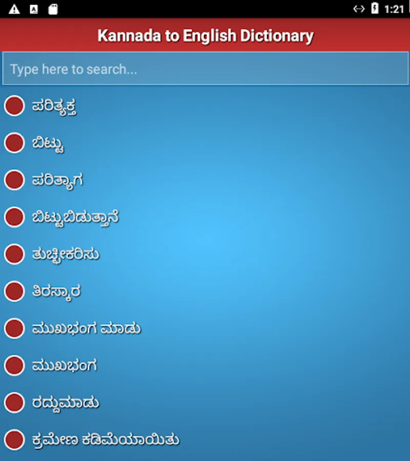 English to Kannada Dictionary is a handy app featuring nearly 80,000 English words and their meaning in Kannada language. Easy navigation to the desired word via typing in search box and a tap on the word. Get meaning in clear Kannada font. Shows "word not found" if that word isn't found in dictionary database.