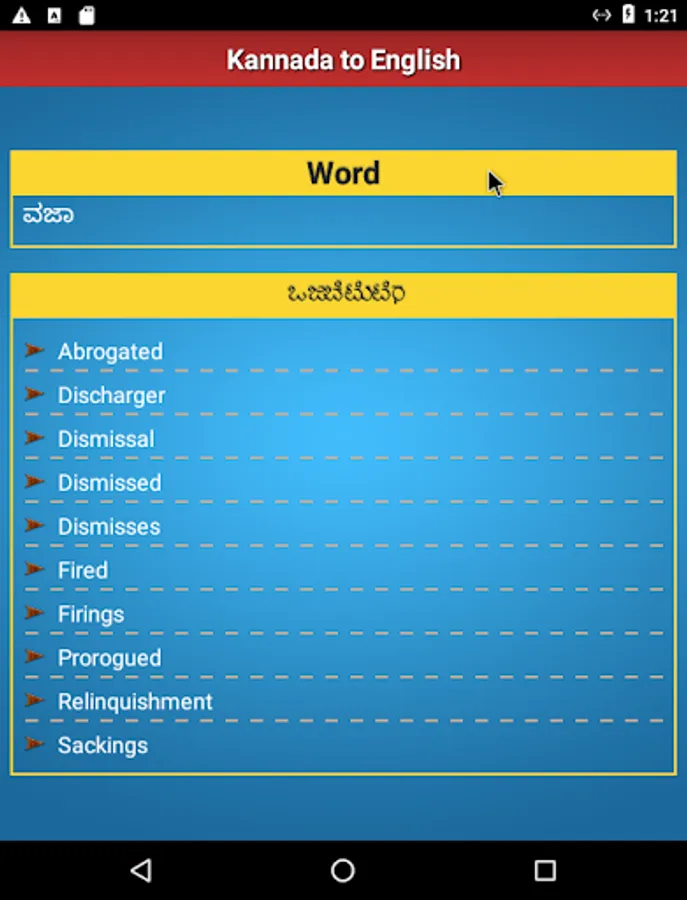 • Kannada to English section: Here you can get Kannada to english translation. No need to separately download another dictionary app for this.