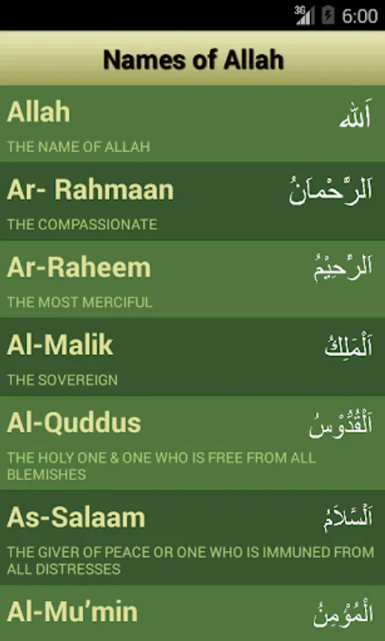 In this app, 99 names of Allah with meaning and benefits of reciting are provided in English and Arabic, for every name of Allah in Quran (Islamic Holy Book). Recite or memorize the 99 names of Allah any time, any where from your phone even without internet.