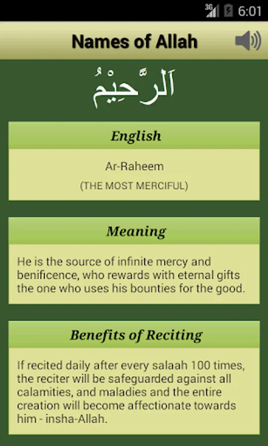 Prophet Muhammad’s life, traditions and his Islam lectures (Sunnah of prophet Muhammad) are of great importance. In Hadith (Islamic books), Prophet Muhammad quotes that there are 99 names of Allah and anyone who memorizes the list of names will be awarded paradise. Install this android app today to get Asmaulhusna audio, the beautiful Nabi names and attributes of Almighty Allah in English and Arabic along with meaning of the names and references from the books of Holy Quran (Koran).