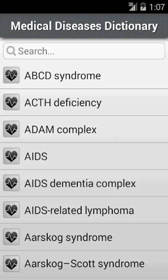 Medical Disease Dictionary contains the latest medical conditions and symptoms used by health care professionals today. Excellent coverage about all disease, symptom and treatment covering general health, internal medicine & biomedical sciences. Learn the diseases and symptoms for help during medical emergencies & treatment of diseases. Download this new disease and drugs dictionary for medication information during medical prescriptions and cure for sure. No need to search anymore for heavy disease books as this medical dictionary application is free to download for android mobile phones.