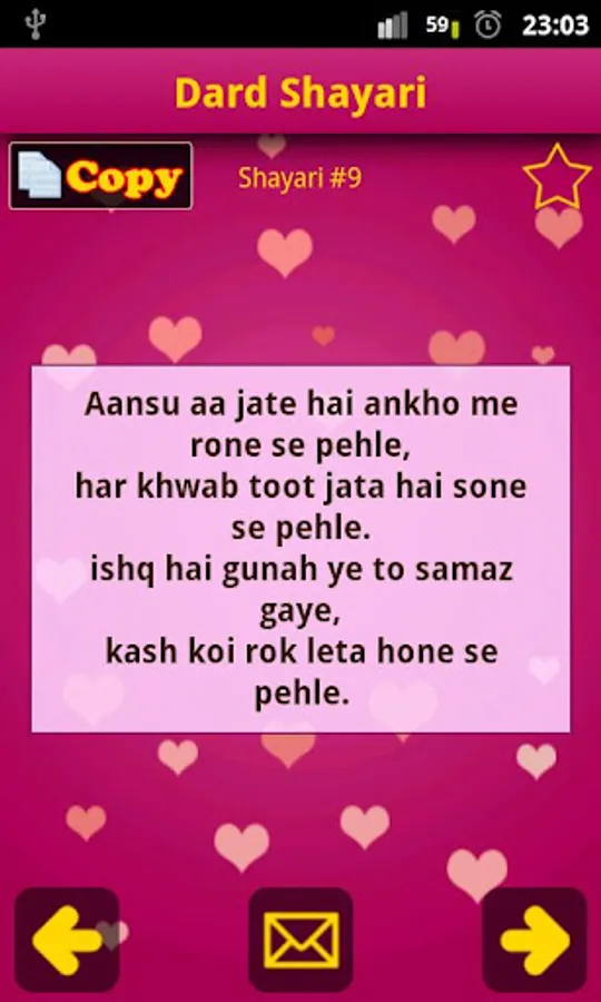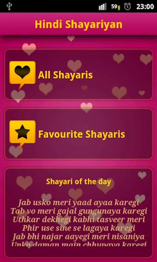 Shayari is used to convey all feelings of love. Ultimate collection of all shayaris across 25+ categories. We have designed this app book in pink with red floating hearts, as pink and hearts depicts emotions.