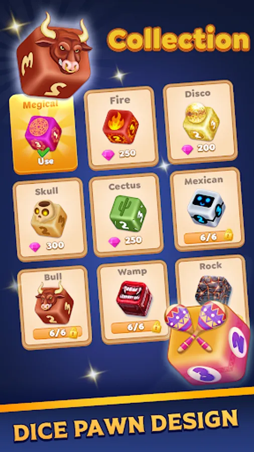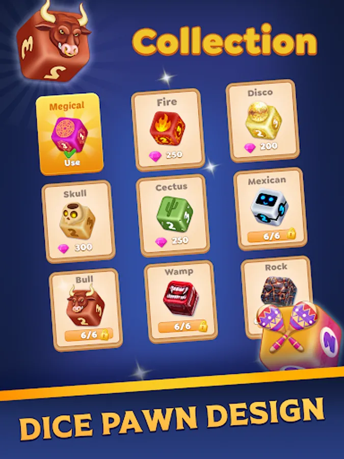 Parchisi PLAY has a collection of beautifully designed Parchis Boards and Dice. You can unlock them very easily and some boards and dices are available for free!