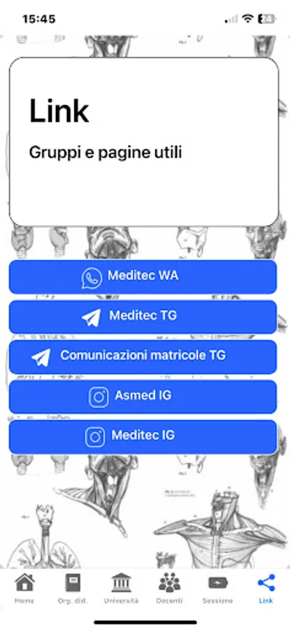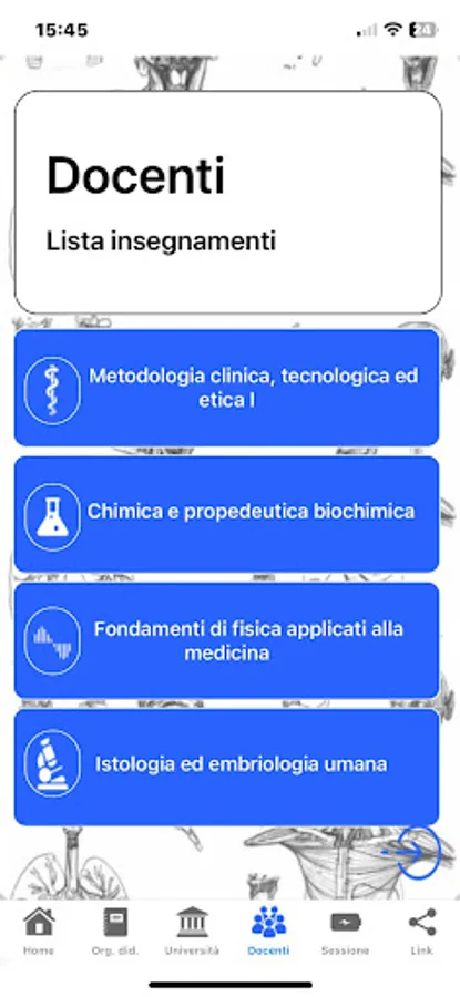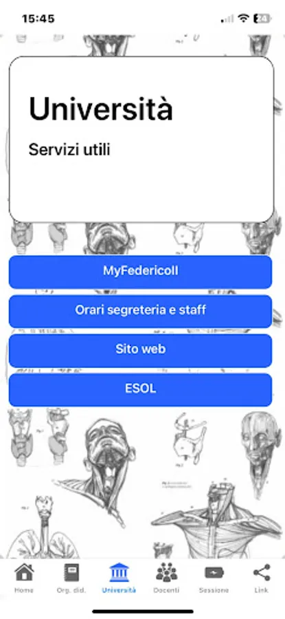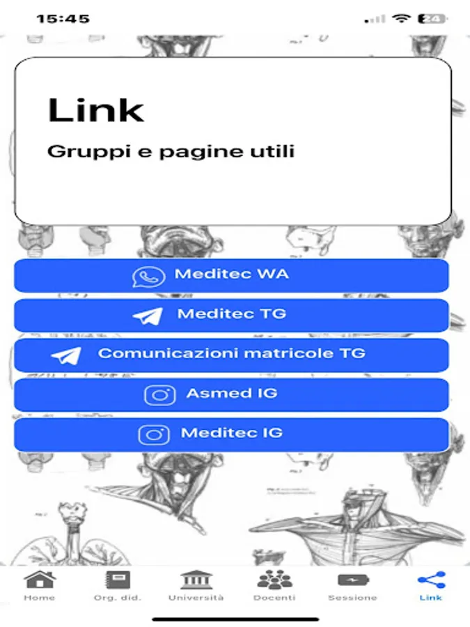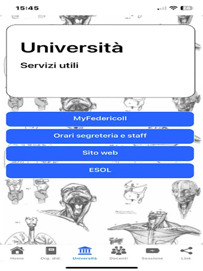 In this app you can find 5 sections that help you to better orient yourself while studying. You can find the Study Plans, University Regulations and lesson times. You will find a section dedicated to your teachers, and the planning of the various courses. You will also find the "Link" section for links to various social networks to better compare yourself with other students.