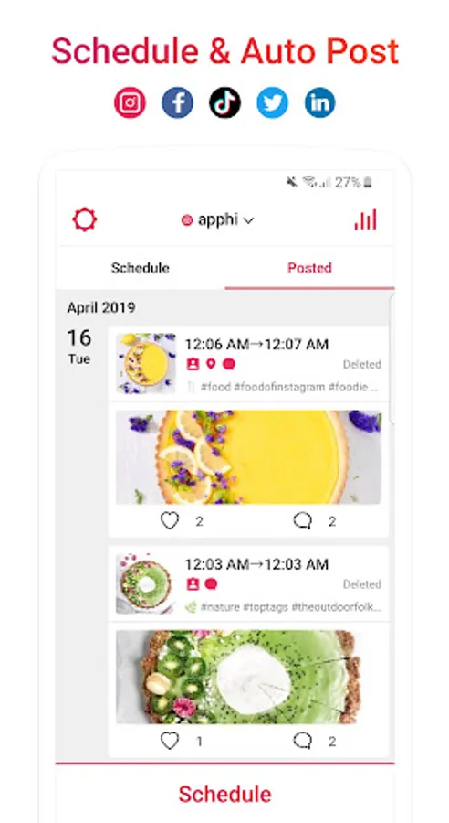 Managing social media account requires a lot of effort. Apphi lets you schedule photo, video, Story, and post them on your Instagram, Facebook, Twitter, TikTok.
