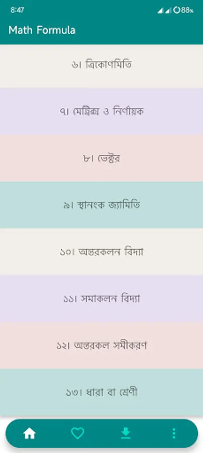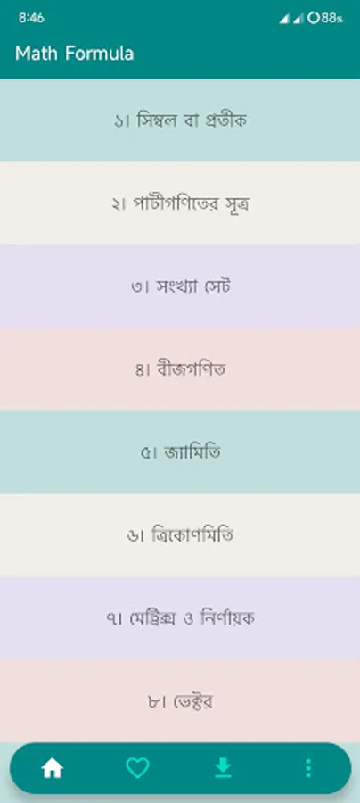 This app is a collection of all kinds of math formulas. It has lot of math formulas. These apps will help for doing math easily. Math is part of our student and all life. If you know math formula, you can do math easily. Math equation is very difficult without math formula. This app has many kind of math solve techniques in Bengali. This math formula app is especially helpful for high school student, collage students, university students and many job seekers.