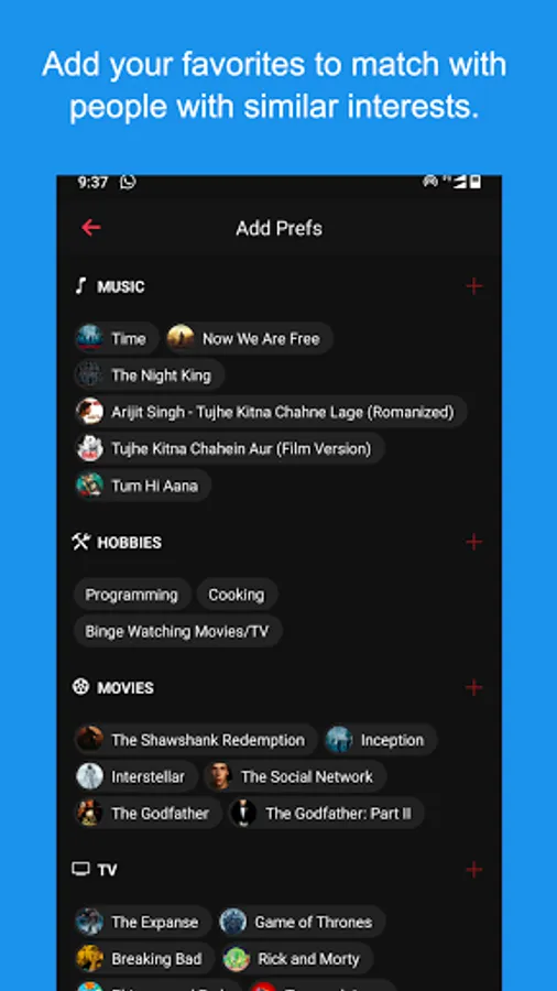 Match provides the ability to add your own Skill, Movies, TV Shows, Music and Artists that you love and see if other people have similar interests to you.