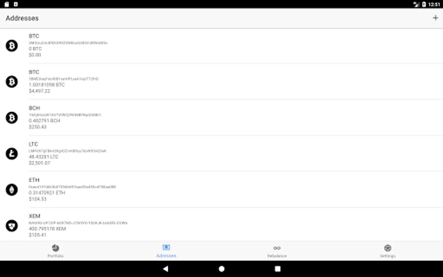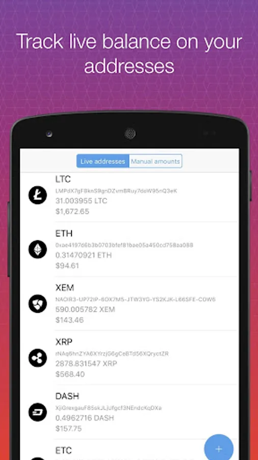 Add your cryptocurrency addresses and monitor your investment portfolio value live.