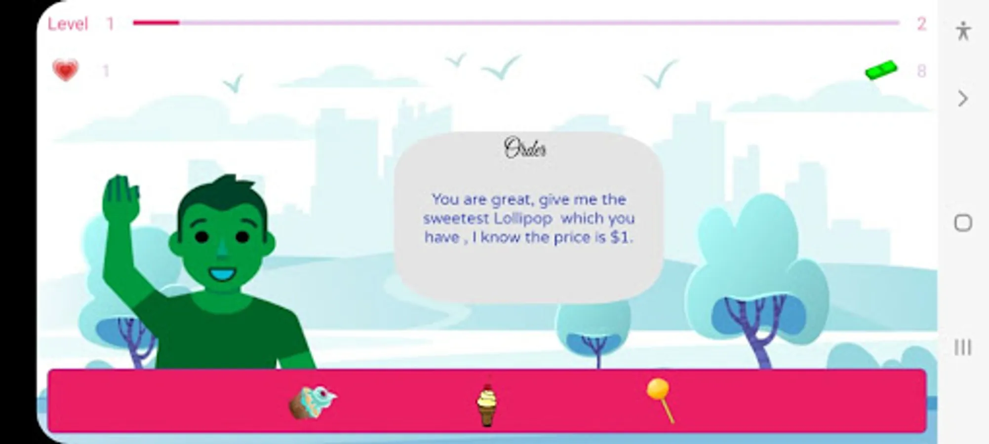 The best delicious desserts are yummy cupcake, yummy softy and lollipop. Hungry people are queuing every hour to buy your sweets for a dollar. You will also live up to your actions. After leveling up, you'll reach new locations!
