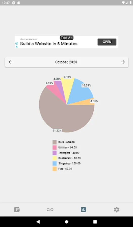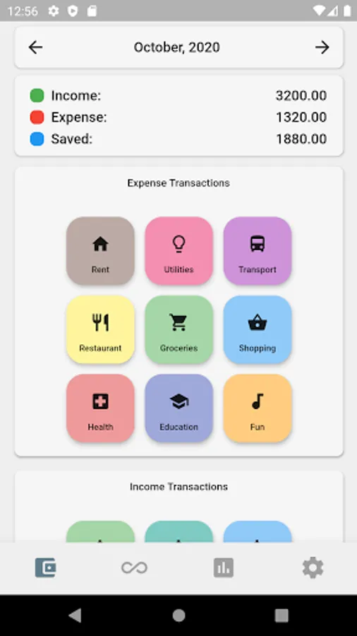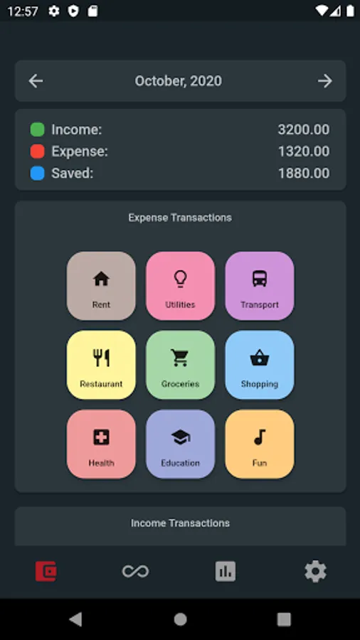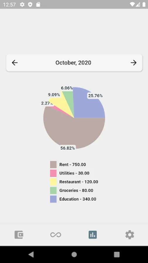 You can also see your monthly transaciton statistics on a chart pie. Easily navigate through months and see the change in your budget.