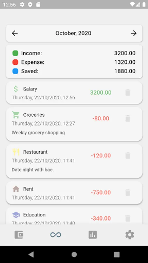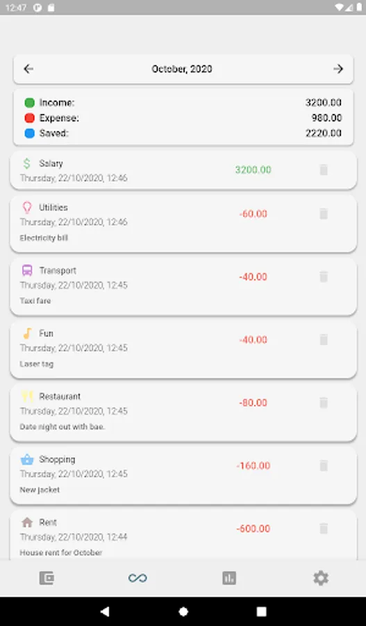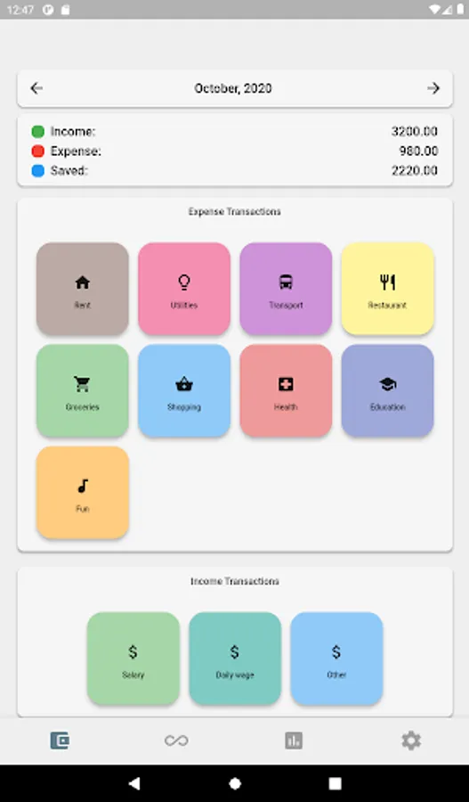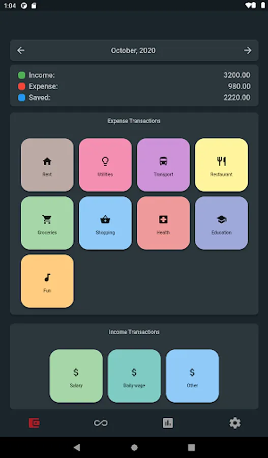 A very simple application to keep track of your earnings and expenditures. There are a few expense categories (i.e. rent, utilities, education, transportation, restaurant) and earning categories (salary, daily wage and others).