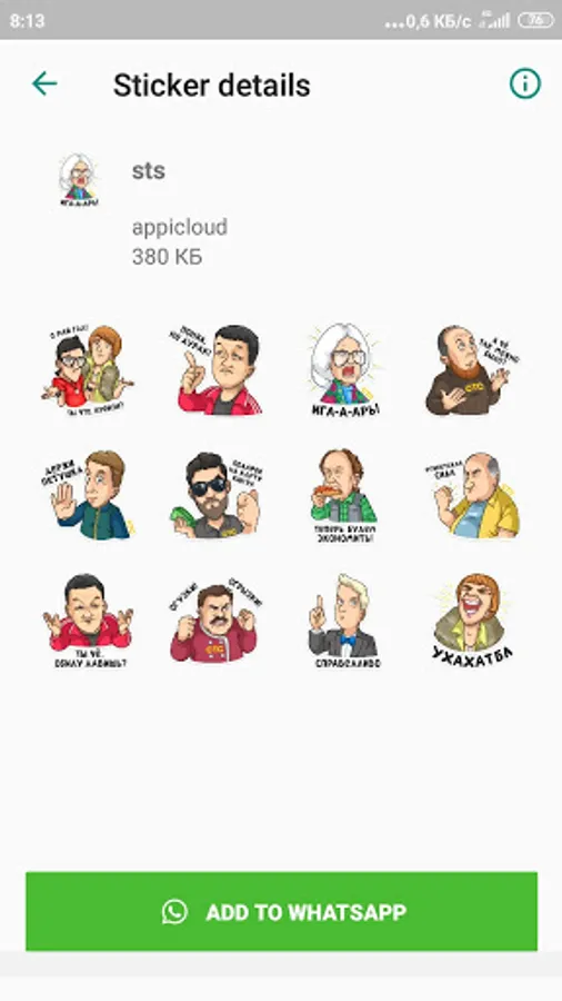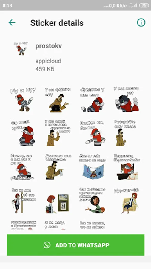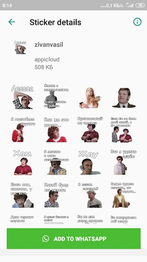 A huge number of stickers for movies and TV shows. There are sets of stickers for Russian movies and TV series, for Hollywood, as well as a bunch of stickers for movies around the world. Stickers are free for WASticker.