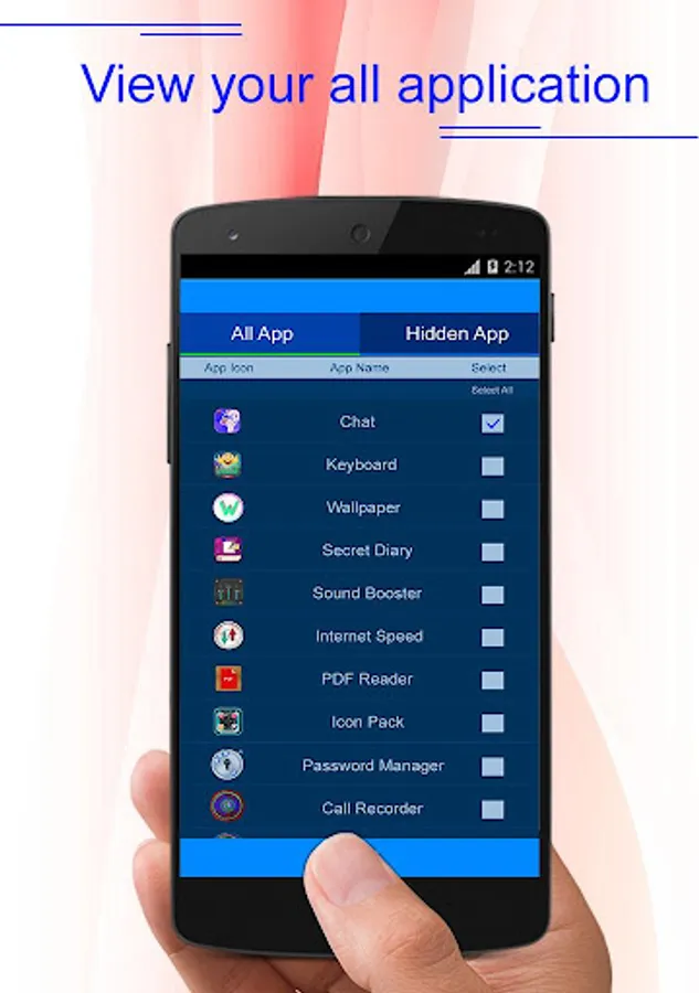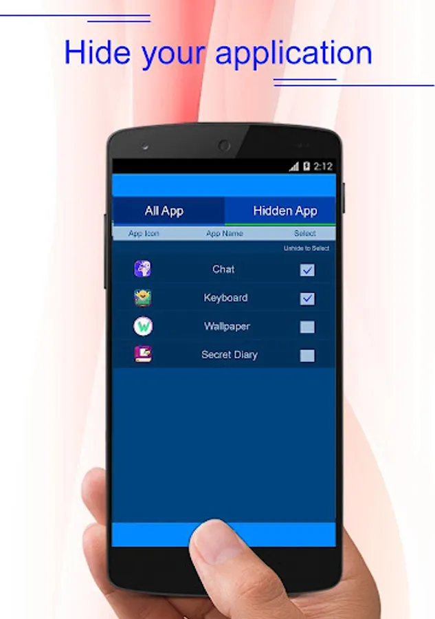 App Icon Hider is a launcher which will hide your apps from the phone menu. It will not uninstall the app but it actually hide your app and no one other than you can access it. Hide your apps from your nosy friends and children with the powerful security access. You just need to tick on the apps icon which you need to be hide and it is done. When you want to add it on the phone menu back just untick it.
