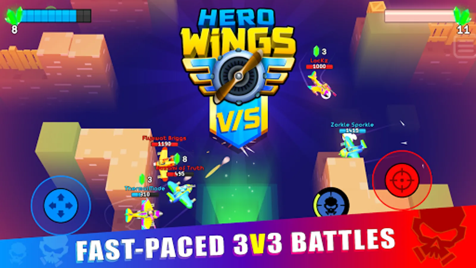 Hero Wings - delivers the most intense free to play action game. Build, upgrade, team up and compete. Survive epic fast-paced 3v3 multiplayer battles. Become the strongest and fastest pilot and destroy the enemy team! Select your fighter from different designs and powers. Choose your primary and special weapons from the great selection including: machineguns, missiles, cannons, shotguns, laser, frost and quantum weapons.