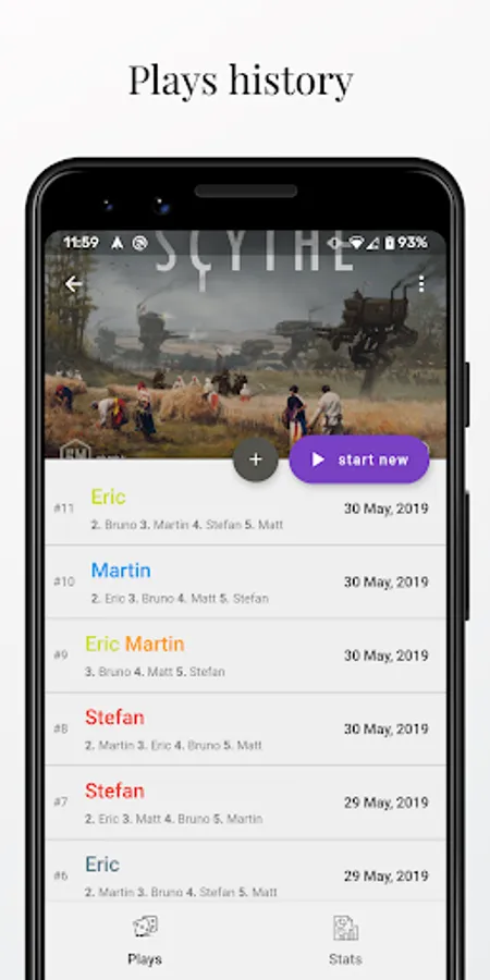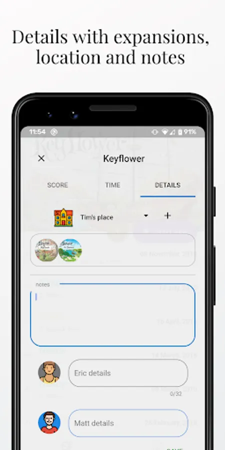 - Tracking board game plays (time, score, expansions played, notes, teams/roles, location)