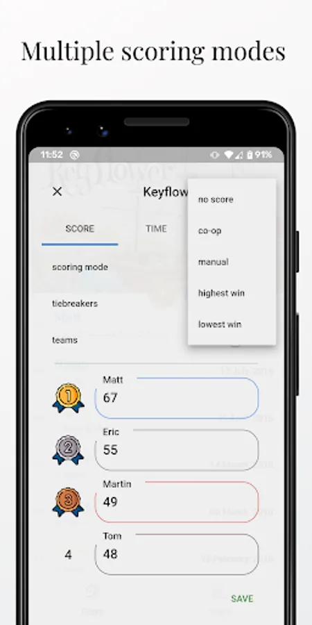 - Scoring modes that fit most games (highest, lowest, manual, coop, no points, solo, tiebreakers)