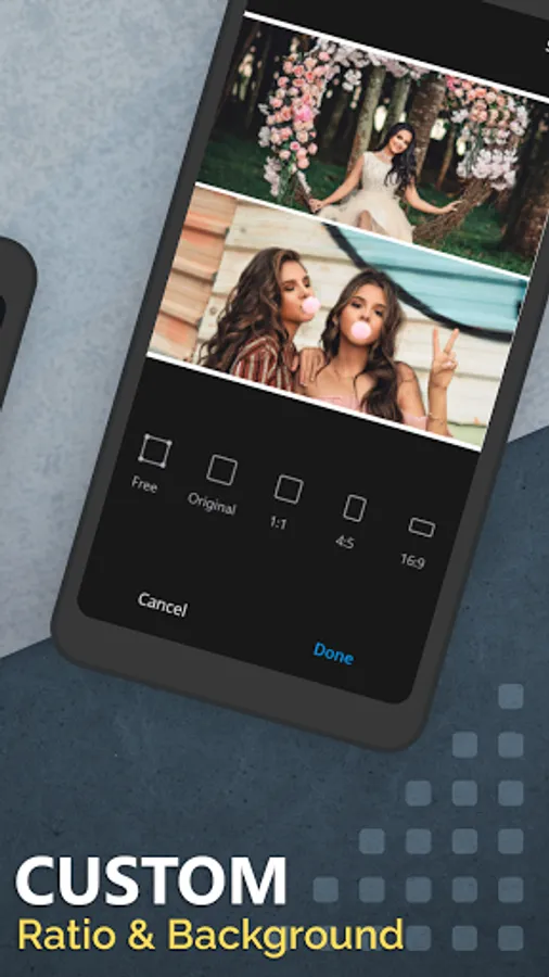 You can choose the ratio of your collage photo. You can choose multiple ratios, 1:1, 4:5, 16:9, 9:16, 3:4, 4:3 ratios. Easily post the entire photo with no crop.
