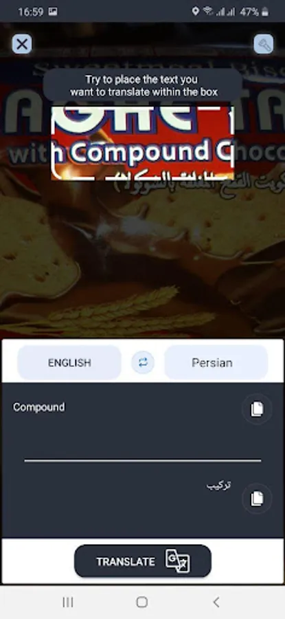 This program turns your phone's camera into a powerful English-Persian dictionary. Just put your phone's camera on the desired text to see the Persian translation or any other language.