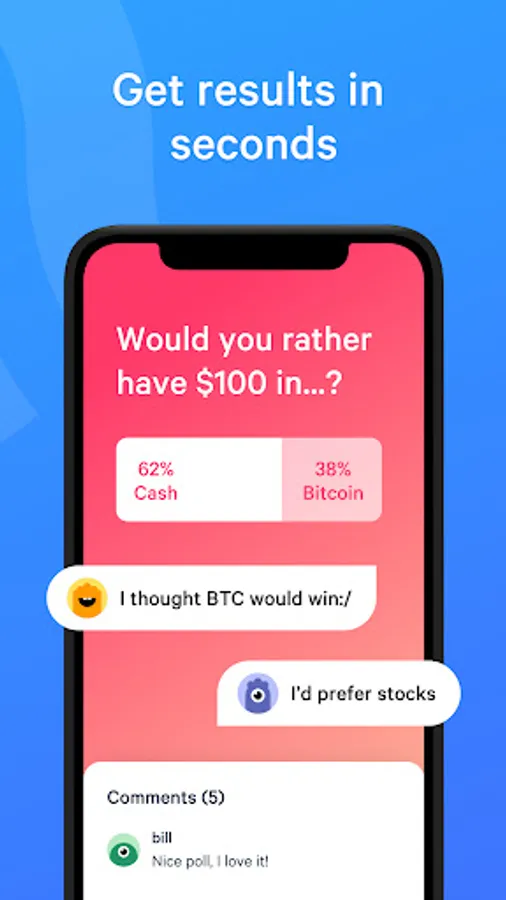 Answer new surveys every day in over 20 categories, such as current topics, politics, or sports, and see what others think. Get hundreds of answers to your anonymous polls in just a few minutes. Level up, compete with the community, earn money and gift cards, or donate to social projects. Try now!