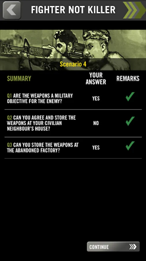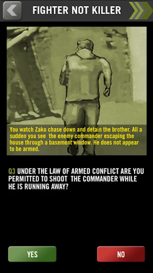 You will find all the answers in this quiz. You will be taken through 28 scenarios covering topics such as tactics of warfare, basic rights, healthcare and aid, weapons or child protection. When you have completed all 6 topics you may move on to the Commander Level with more complex scenarios.
