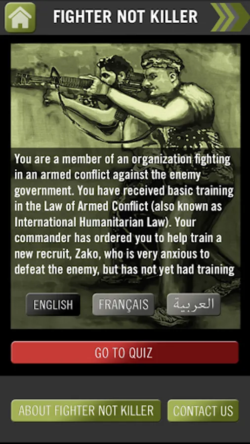 Welcome to FIGHTER NOT KILLER, a quiz that will enable you to test your knowledge of the Laws of Armed Conflict.
