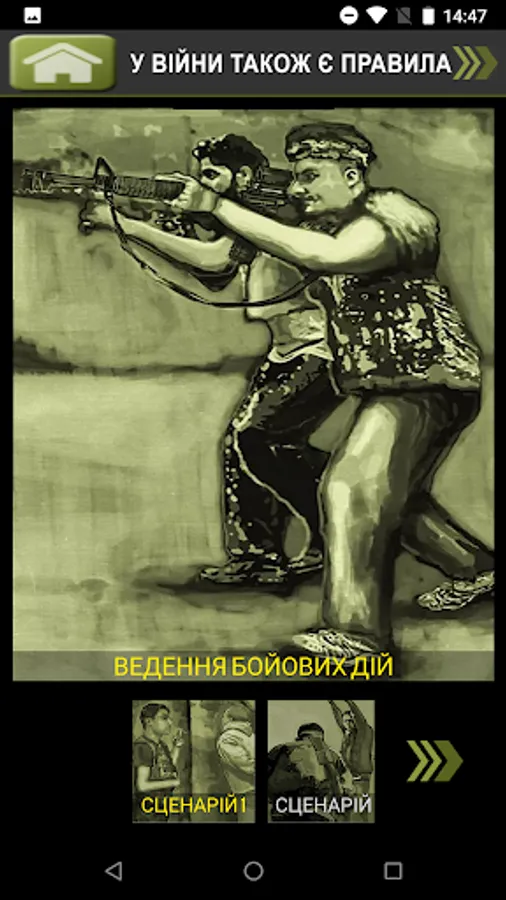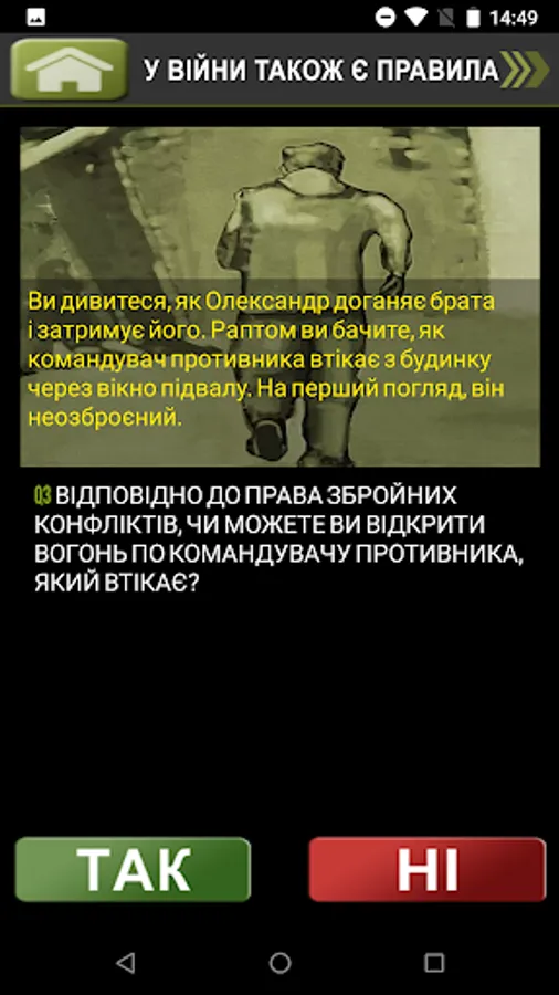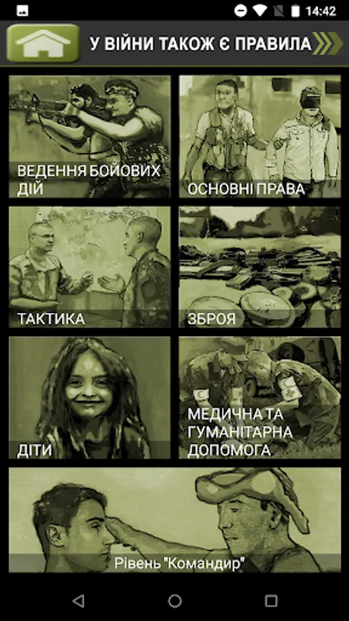 You will find all the answers in this quiz. You will go through 28 scenarios covering topics such as "War Tactics", "Fundamental Rights", "Medical Care", "Weapons" or "Child Protection". When you finish all the topics, you will be able to move to the level of commander with more complex scenarios.