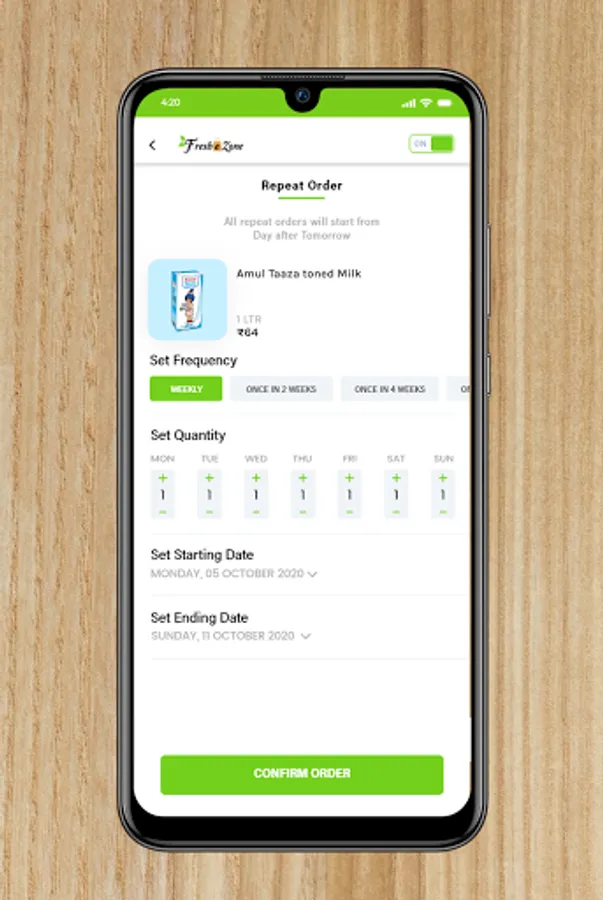 Do you need Milk and Bread daily? No need to place the same order every day. Our ‘Repeat Order’ option gives you the ability to set a delivery schedule for items that you use regularly and sit back and enjoy convenience at its best. Whether it’s just one packet of milk daily, bread on alternate days, a dozen eggs over the weekend or fruits and vegetables delivered on a specific day – customise it the way you want!