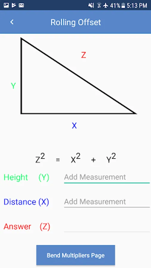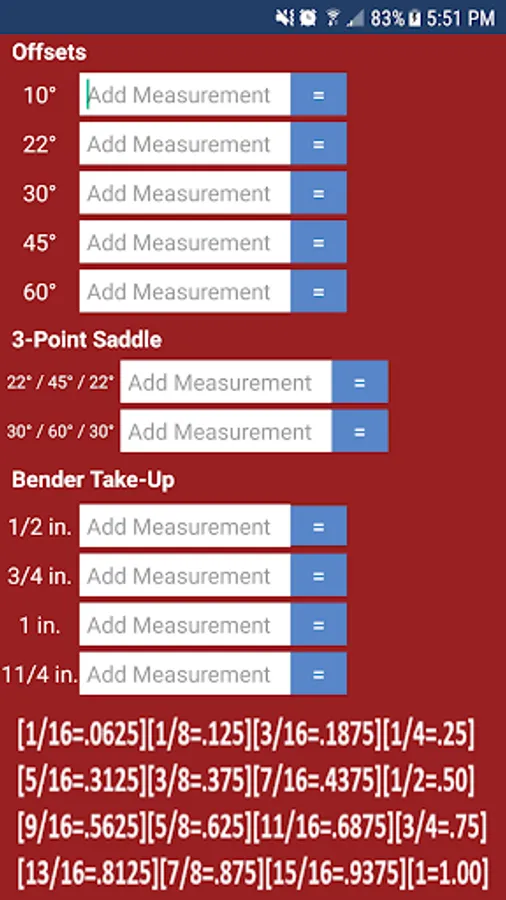 The BEND MULTIPLIERS button brings you to a page where you just have to add in your measurement and hit the = button. It will give you the proper multiplier measurement for the bend you intend to make. Also you will find a fractions to decimal conversion sheet.