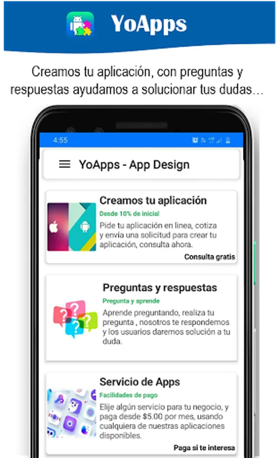 The YoApps application offers an interactive menu, free and paid templates, free questions and answers, to answer all your questions about applications, courses available in future updates and personalized services to design your application.