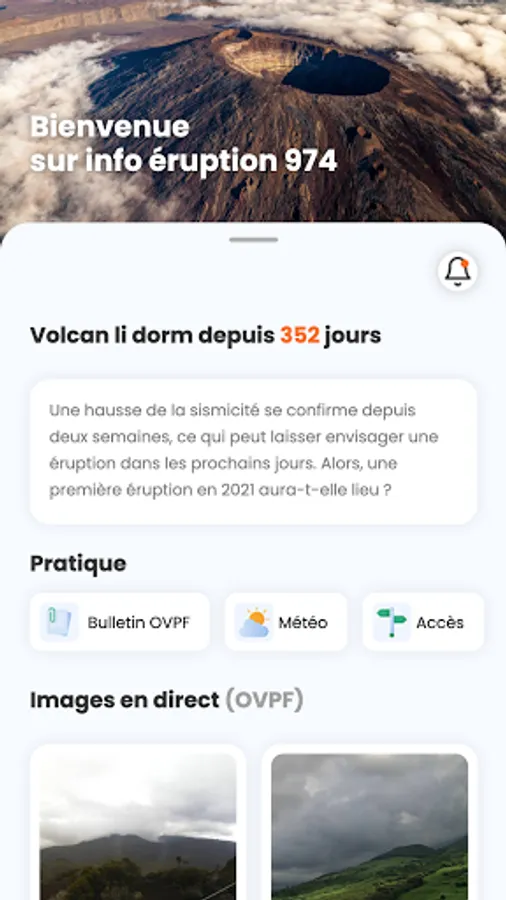 Volcano the farted? Be the first to know. Find on this mobile application the current state of the Volcano Piton de la Fournaise on the island of Reunion and activate the notifications to be alerted as soon as possible of a new eruption.