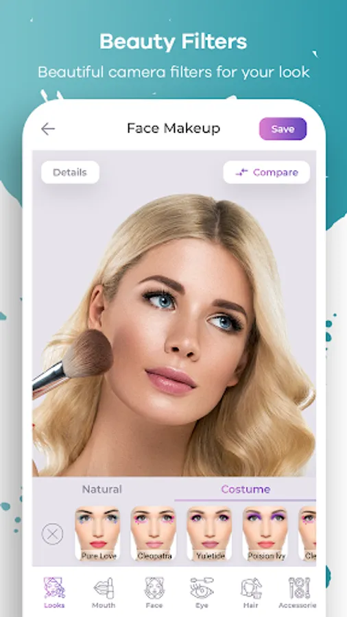 ✨ Try some amazing features for highlighting your eyes, such as: longer eyelashes, edit eye color, put beautiful eye shadows to get the professional makeup look, get the cat eyes with an eyeliner editor, embellish your eyebrows and so much more.