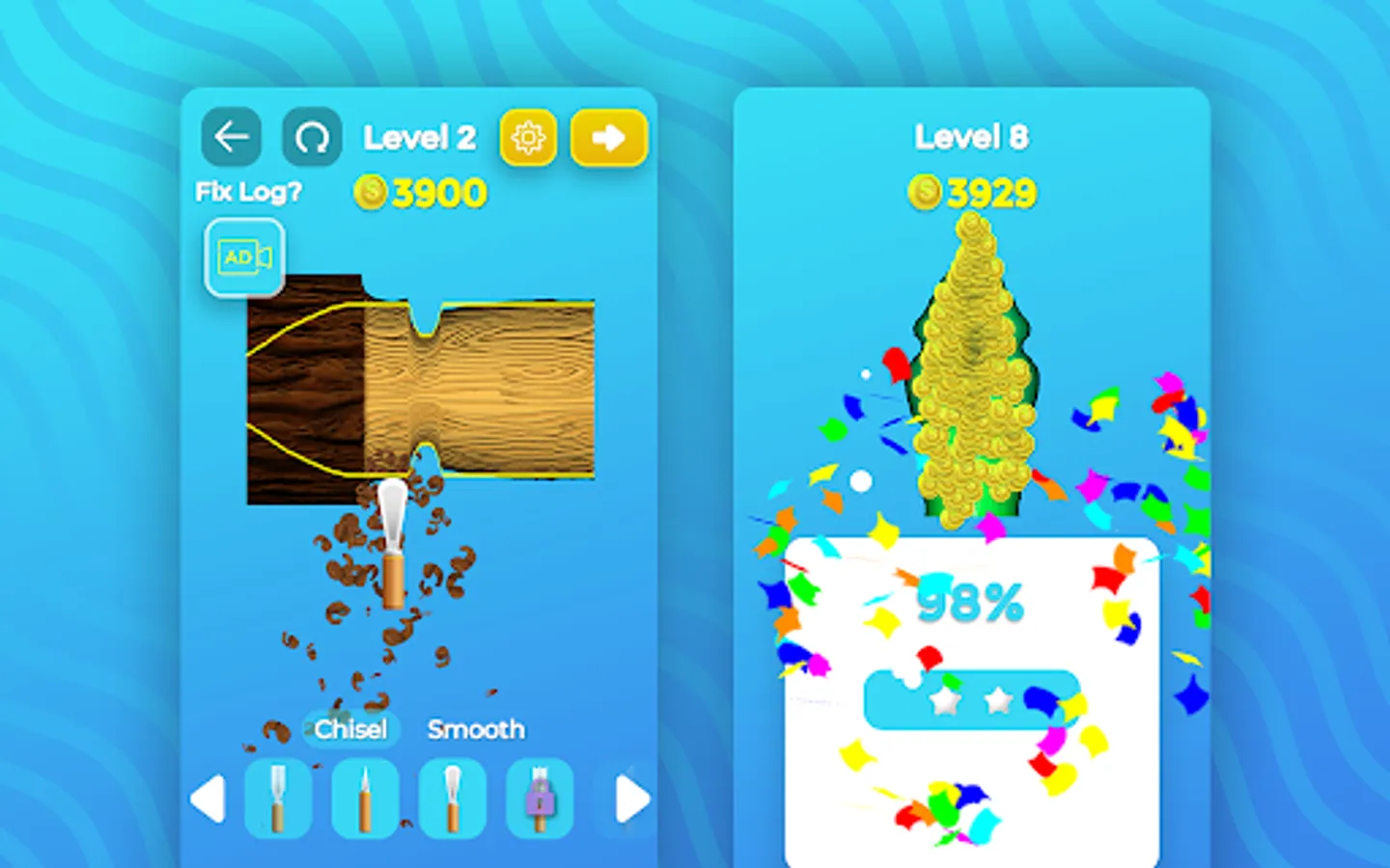 🔵 If you make a mistake while carving, don’t worry you can always fix your log by watching a short ad and your shape will return at the uncarved position.