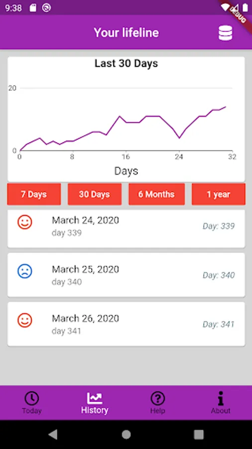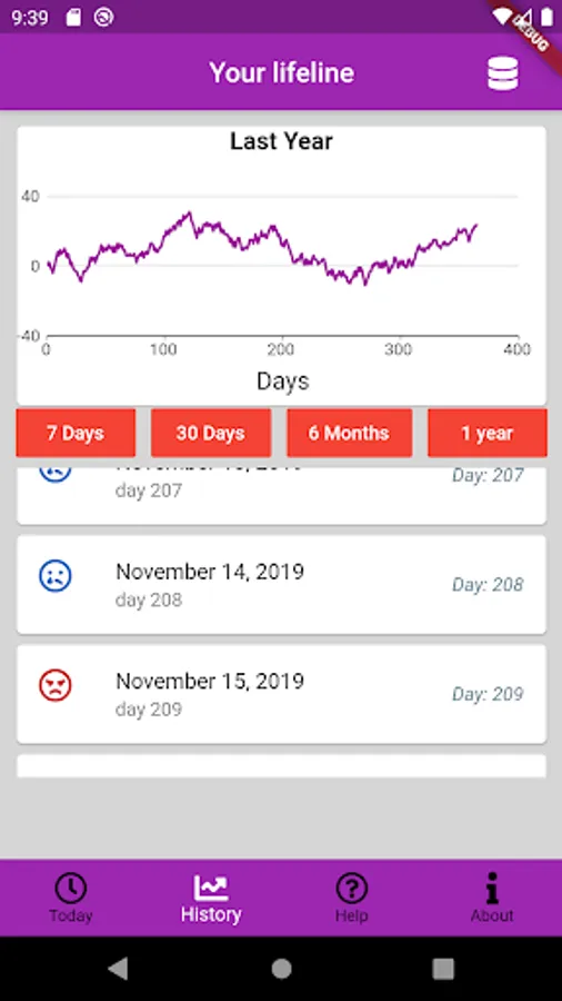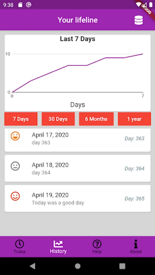 By keeping track of your days back to back, you’ll get an accurate representation of your historical “lifeline”. View your "lifeline" as it unfolds over the last week, months, or year. Keep a journal of each day that's easily referenced as well.