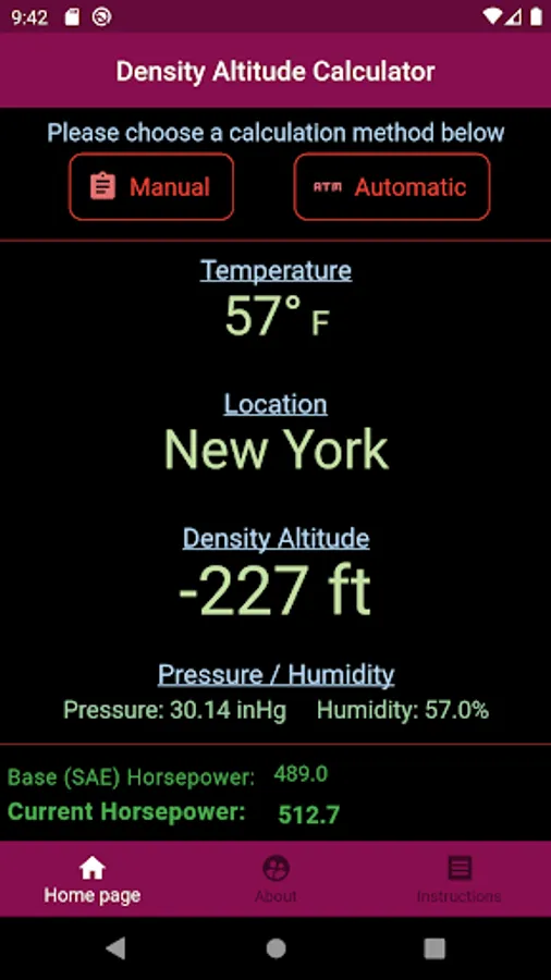 Streets DA offers you a quick and accurate reading of your current density altitude and how it affects your vehicle's current horsepower. Weather data is pulled from the nearest weather station from your phone's latitude/longitude coordinates. The app then precisely calculates your density altitude from the current temperature, pressure, and either dew point or humidity. In addition, your vehicle's base horsepower is also calculated to reflect what it's actually making in the current weather conditions.