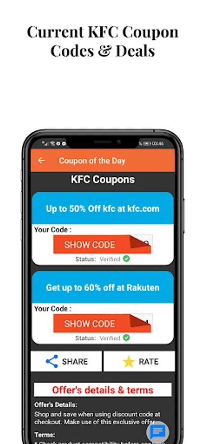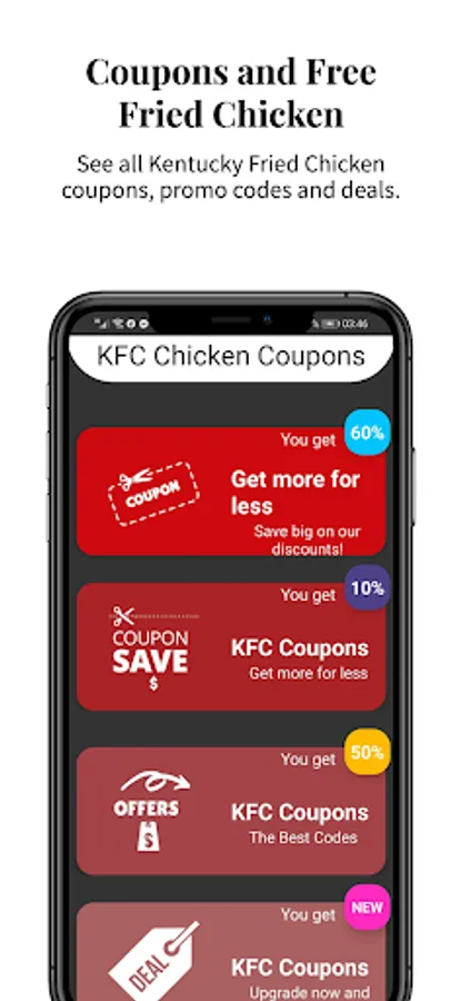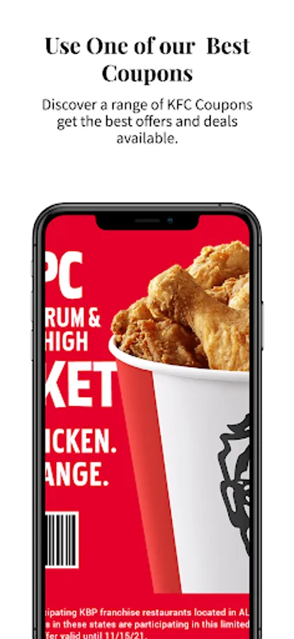 Note: This application is not affiliated with KFC. We are a coupon code aggregator and aggregate coupons for your convenience for Kentucky Fried Chicken.
