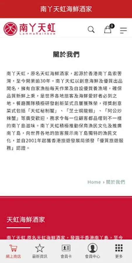 Lamma Rainbow, formerly known as Rainbow Seafood Restaurant, originated in Sok Kwu Wan, Lamma Island, Hong Kong. It has been in business for more than 30 years. Lamma Rainbow is famous for its creative seafood and high-quality products. It has its own fishing boats that operate daily and its own high-quality fish farms to ensure that the quality is fresh and high-quality. It is a must-see for tourists and seafood lovers from all over the world. The restaurant team actively develops innovative dishes and has won awards. The award-winning creative dishes include "Rainbow Secret Crab", "Cheese Baked Lobster", "A Kung Fried Spicy Crab" and other popular dishes, so that every customer can taste it It's a different kind of Lamma Island. Lamma Rainbow actively promotes the preservation of fishermen’s culture and the promotion of Lamma Island. It showcases the unique fishermen’s culture of Lamma Island to tourists from all over the world. Since 2001, it has been awarded the "Quality Tourism Services" certification by the Hong Kong Tourism Board.