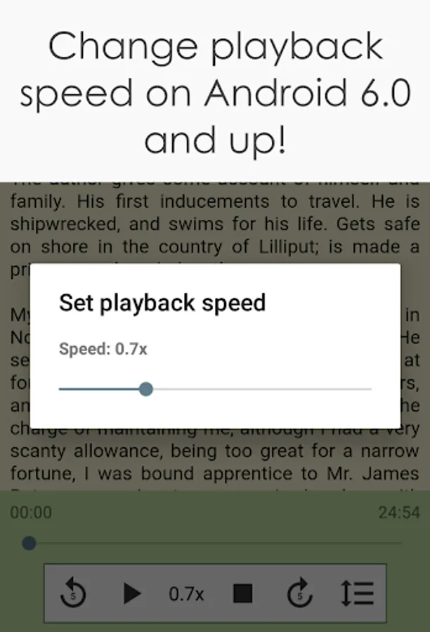 - change playback speed (only on Android 6.0 and up), useful for English learners