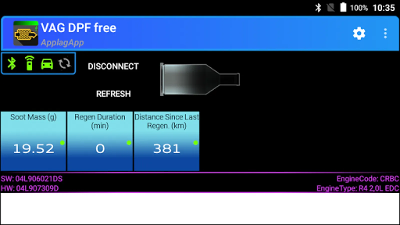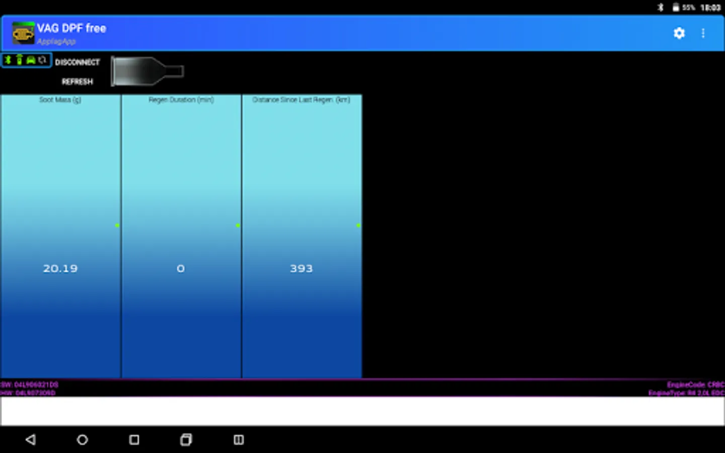 VAG DPF lite is the free version of the application VAG DPF that show you the most important data related to the DPF particulate filter and its regeneration phases using an ELM327 Bluetooth/WIFI adapter. With this free app you can statically view 3 parameters related to the particulate filter status. This app doesn't use standard OBD2 commands as almost all other apps, it uses directly CAN commands specific of car model and this is the reason why it doesn't work with every car; due to the use of CAN commands, the app needs al least a decent ELM327 adapter (see note below); some users reports correct app working with a 10-15 euro adapter.