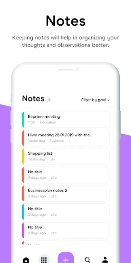 For that, one has to set up S.M.A.R.T. goals, create a roadmap for themselves by breaking a goal down into habits and/or one time tasks, set time for doing those actions and manage the time from calendar section. Finance section can be used to achieve financial goals in life. All the actions run through a "Task-management" system at a home-screen from where it is possible to add a note to every action. This makes it possible to add a different way among many built-in tracking possibilities to track the process of achieving your goals by your own words.