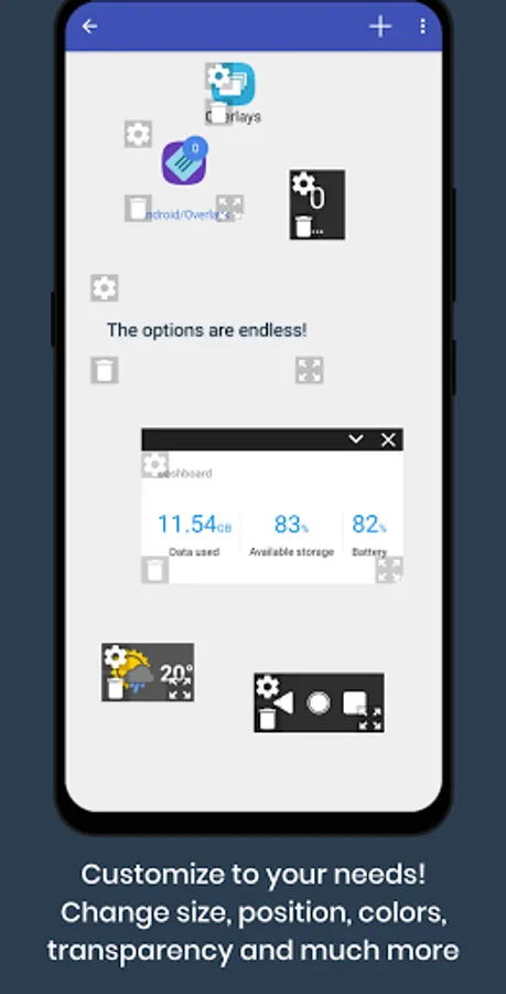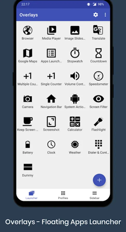 - Floating Camera, Translate, Stock details, Calculator, Dialer and Contacts, Timer, Stopwatch, Weather, Clock, Battery, Flashlight, Navigation Bar (Assistive touch), Screenshot button (Android 9.0+), Screen Filter, Clipboard (Android 9 and below), Simple Text and more!