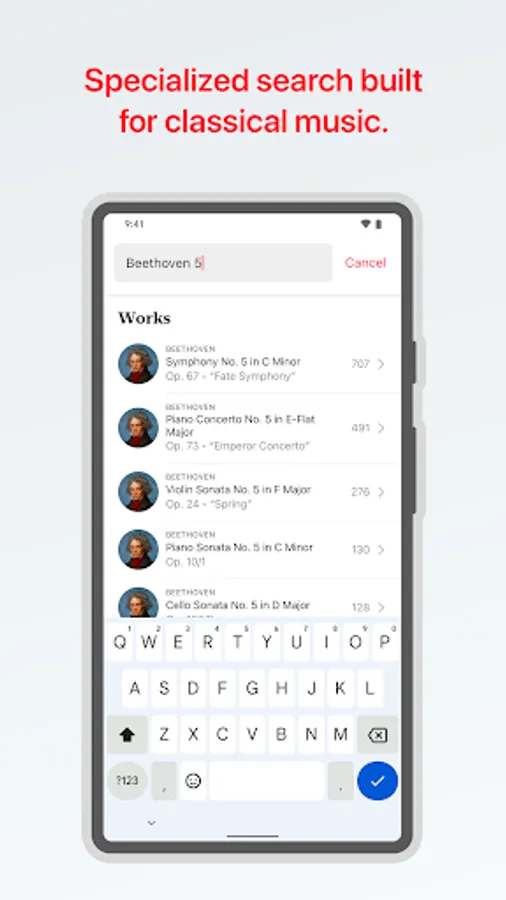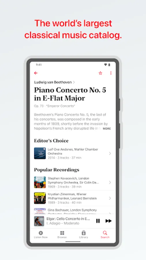 • Search by composer, work, conductor, or even catalog number, and find specific recordings instantly.