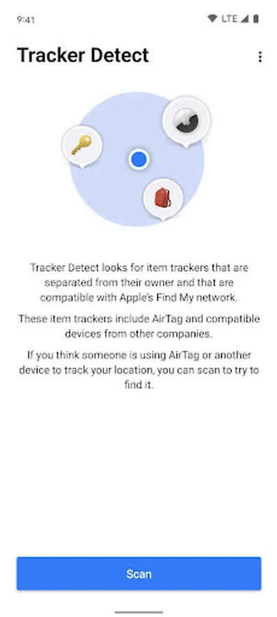 Tracker Detect looks for item trackers that are separated from their owner and that are compatible with Apple’s Find My network. These item trackers include AirTag and compatible devices from other companies. If you think someone is using AirTag or another device to track your location, you can scan to try to find it.
