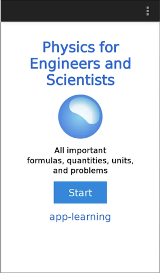 Some parts of the app are for obtaining information and some parts are for exercising. The information part comprises the content items 'Formulas', 'Quantities', and 'Units'. The exercising part comprises the content items 'Formula Quiz' and 'Problems'. Each of the items is structured according to the fields mechanics, thermal physics, electricity, magnetism, and optics.
