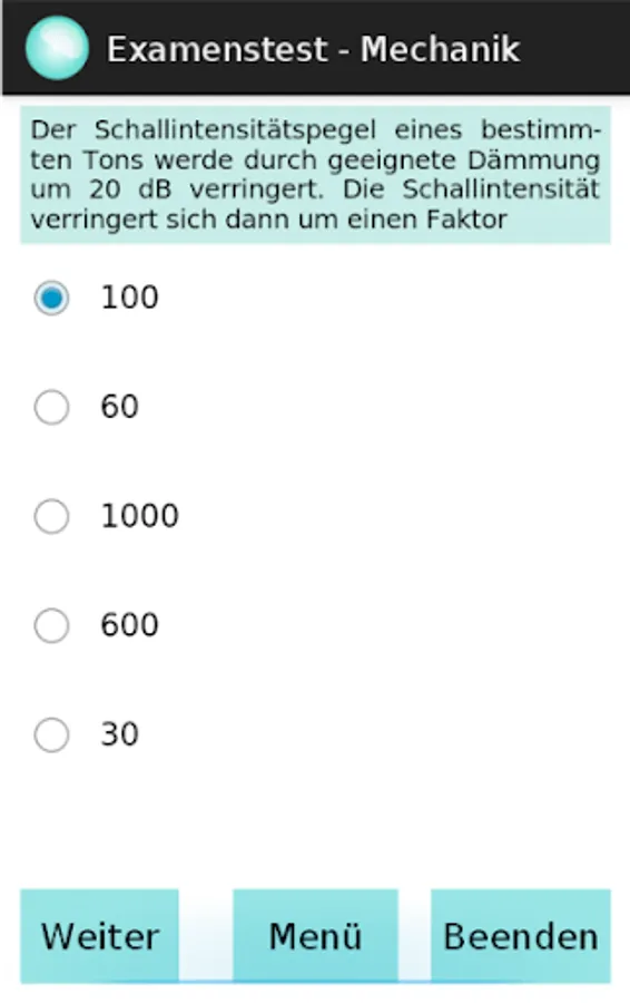 The category 'Exam Test' serves to practice all variants of questions and tasks as required in physics and physics exams. This includes the understanding of physical terms and relationships as well as calculations based on physical formulas. For intensive training there are three different versions (Starter, Repeater and Addict). You can select a sub-area, several sub-areas or all sub-areas. The selection of all subdomains corresponds to a sample of the physicum.