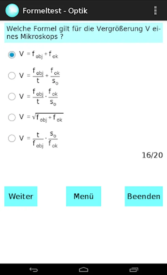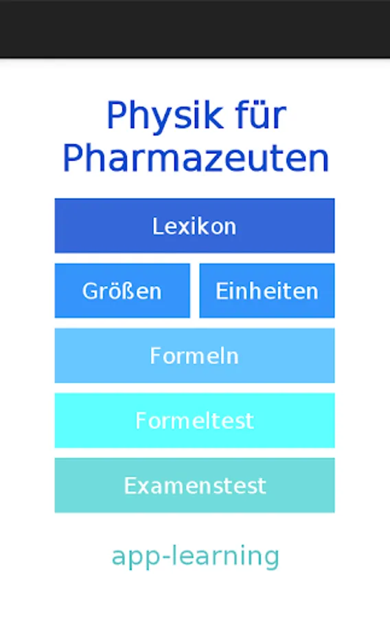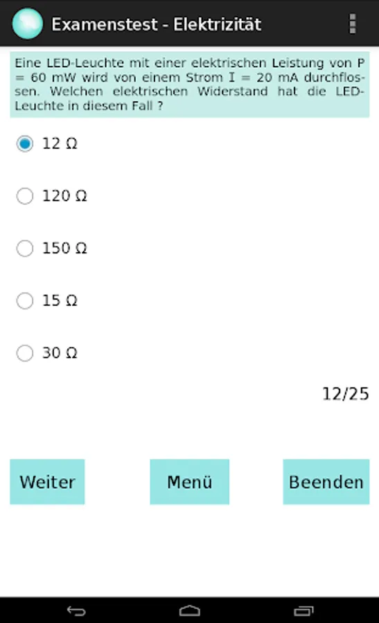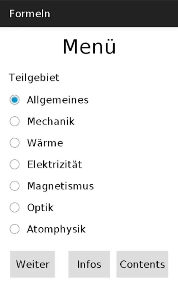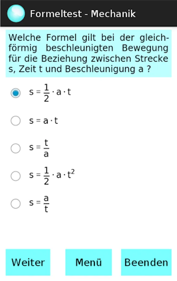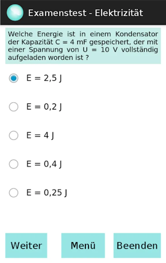 The 'Exam Test' section serves to practice all variants of questions and tasks as required in state examinations and in physics examinations. This includes the understanding of physical terms and relationships as well as calculations based on physical formulas. For intensive training there are three different versions (Starter, Repeater and Addict). You can select a sub-area, several sub-areas or all sub-areas. The selection of all sub-areas corresponds to a sample of the state examination.