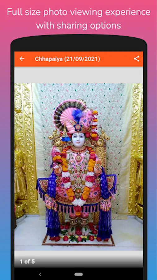 - Calendar view that allow user to view darshan photos by selecting specific date or by selecting listed special days like Festival, Public holidays, Ekadashi and Punam