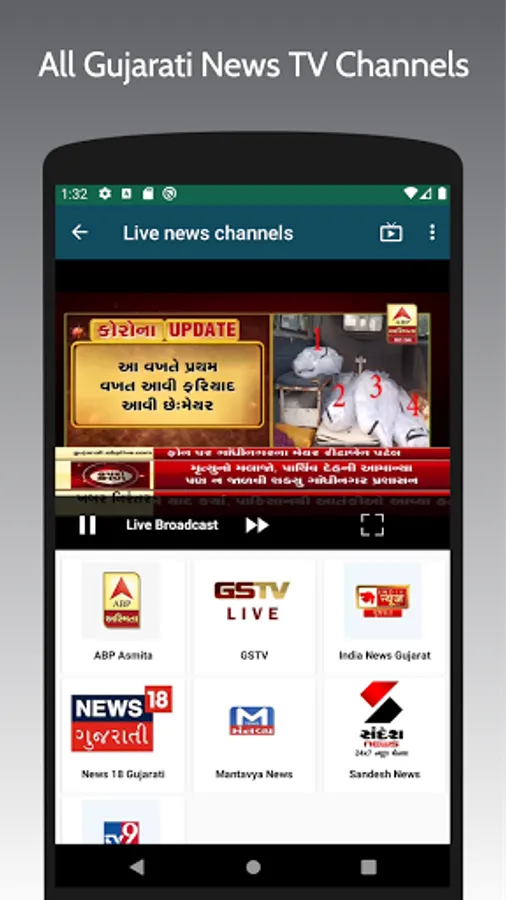 Watch live Gujarati news TV channels such as Sandesh News, ABP Asmita, GSTV, News 18 Gujarati, TV9 Gujarati etc..