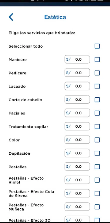 Barbershop, Aesthetics, Spa and Makeup services and price them.