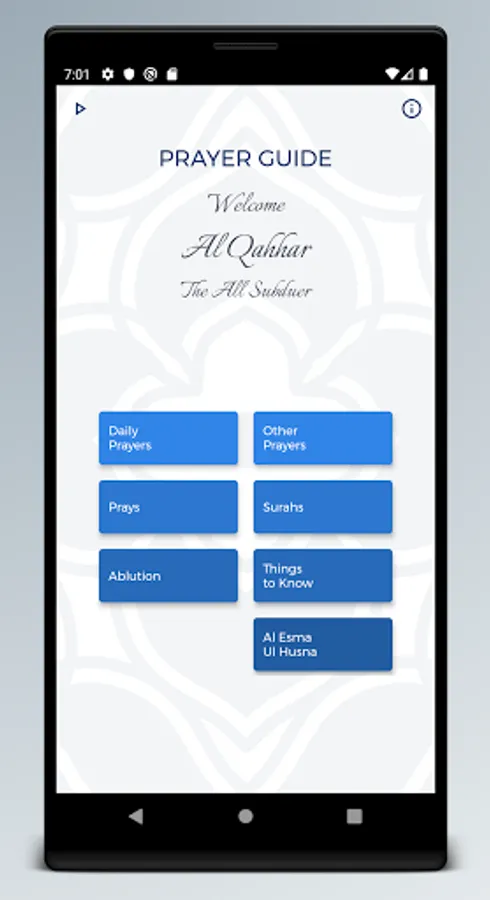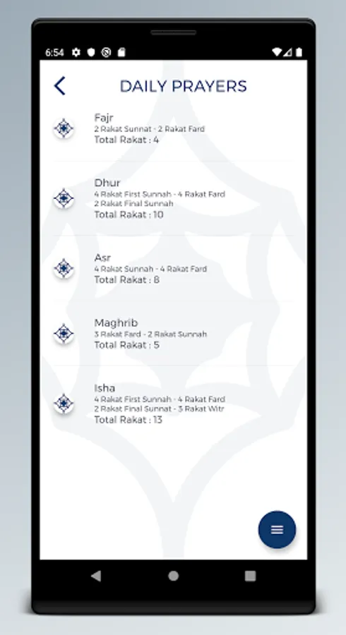 Includes five times daily Salah: Fajr, Duhr, Asr, Magrib and Isha.